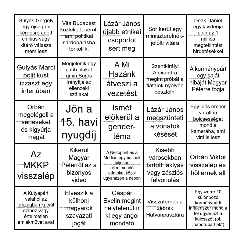 This bingo card has 25 images and 25 words: Kikerül Magyar Péterről az a bizonyos videó, Gáspár Evelin megint helytelenül ír ki egy angol mondato, A Mi Hazánk átveszi a vezetést, A Kutyapárt valahol az országban kátyút színez vagy értelmetlen emlékművet avat, Deák Dániel egyik videója eléri az 1 milliós megtekintést hirdetésekkel, Gulyás Gergely egy újságírói kérdésre adott cinikus vagy kitérő válasza mém lesz, Gulyás Marci politikust izzaszt egy interjúban, Vita Budapest közlekedéséről, ami politikai sárdobálásba torkollik., Lázár János megszünteti a vonatok késését, A Nézőpont és a Medián egymásnak teljesen ellentmondó adatokat közöl ugyanazon a napon, Szentkirályi Alexandra megint próbál a fiatalok nyelvén posztolni, Orbán megelégeli a sértéseket és kigyúrja magát, Kisebb városokban tartott fáklyás vagy zászlós felvonulás, Orbán Viktor visszalép és böllérnek áll, Megjelenik egy újabb plakát, amin Soros irányítja az ellenzéki szálakat, Egyszerre 10 különböző kormánypárti influenszer mondja fel ugyanazt a kulcsszót (pl. „háborúpártiak”), Egy idős ember váratlan bölcsességet mond a kamerába, ami virális lesz, Lázár János újabb etnikai csoportot sért meg, A kormánypárt egy saját hibáját Magyar Péterre fogja, Jön a 15. havi nyugdíj, Ismét előkerül a gender-téma, Elveszik a külhoni magyarok szavazati jogát, Az MKKP visszalép, Sor kerül egy miniszterelnök-jelölti vitára and Visszatérnek a zebrák Hatvanpusztára.