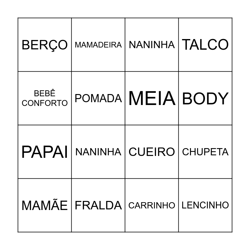 This bingo card has 16 words: FRALDA, CHUPETA, NANINHA, BERÇO, PAPAI, MAMADEIRA, CUEIRO, CARRINHO, BEBÊ CONFORTO, POMADA, MAMÃE, TALCO, NANINHA, BODY, MEIA and LENCINHO.
