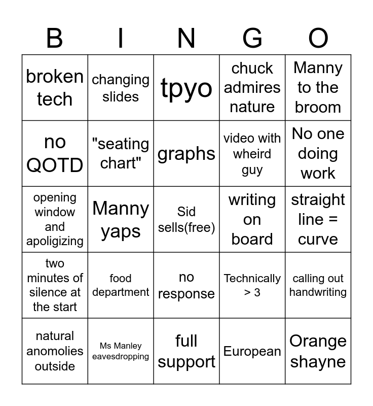 This bingo card has a free space and 27 words: Technically > 3, Highly specific example, video with wheird guy, full support, no QOTD, tpyo, changing slides, two minutes of silence at the start, writing on board, calling out handwriting, opening window and apoligizing, chuck admires nature, natural anomolies outside, Ms Manley eavesdropping, No one doing work, Video doesn't load, "seating chart", graphs, food department, broken tech, straight line = curve, European, Manny yaps, Orange shayne, no response, Manny to the broom and Evan before we leave.