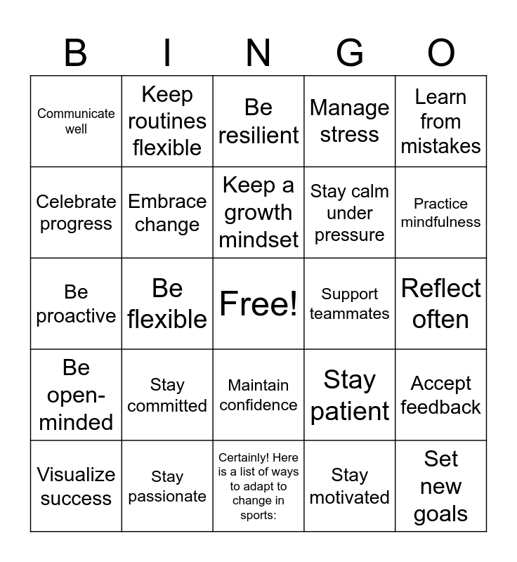 This bingo card has a free space and 31 words: Certainly! Here is a list of ways to adapt to change in sports:, Stay positive, Be flexible, Keep learning, Communicate well, Be resilient, Embrace change, Stay patient, Support teammates, Stay motivated, Reflect often, Set new goals, Stay adaptable, Focus on controllables, Practice mindfulness, Keep trying new things, Accept feedback, Stay committed, Be open-minded, Maintain confidence, Learn from mistakes, Stay focused, Visualize success, Keep routines flexible, Stay calm under pressure, Celebrate progress, Manage stress, Be proactive, Stay passionate, Keep a growth mindset and Support others.