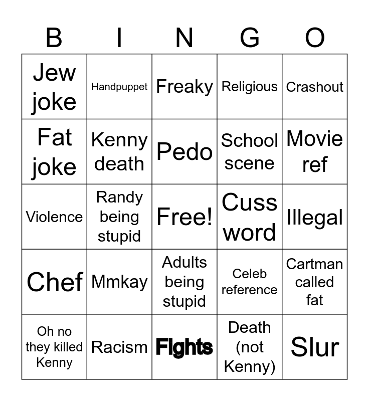 This bingo card has a free space and 24 words: Mmkay, Racism, Pedo, Oh no they killed Kenny, Crashout, Jew joke, Fat joke, Handpuppet, Cuss word, Adults being stupid, School scene, Violence, Celeb reference, Cartman called fat, Kenny death, Death (not Kenny), Illegal, Freaky, Movie ref, Randy being stupid, Slur, Chef, Religious and Fights.