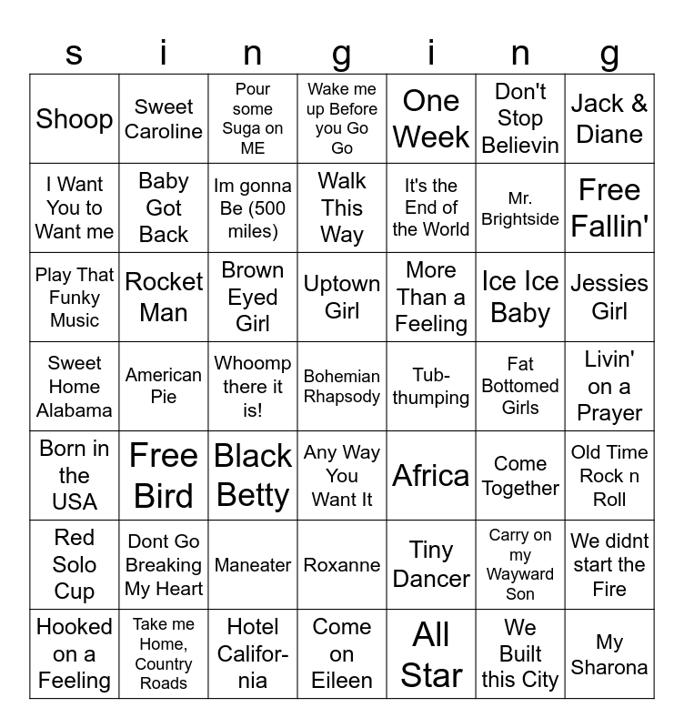 This bingo card has a free space and 48 words: Tiny Dancer, Mr. Brightside, Come on Eileen, American Pie, Brown Eyed Girl, Livin' on a Prayer, Sweet Caroline, Take me Home, Country Roads, Don't Stop Believin, Any Way You Want It, Jack & Diane, Wake me up Before you Go Go, Ice Ice Baby, More Than a Feeling, Red Solo Cup, Fat Bottomed Girls, I Want You to Want me, Free Fallin', Carry on my Wayward Son, One Week, It's the End of the World, Whoomp there it is!, Shoop, Baby Got Back, We didnt start the Fire, Im gonna Be (500 miles), Jessies Girl, Hooked on a Feeling, Uptown Girl, Rocket Man, We Built this City, Tub- thumping, Old Time Rock n Roll, Dont Go Breaking My Heart, Sweet Home Alabama, Africa, Come Together, Play That Funky Music, Black Betty, Maneater, Born in the USA, My Sharona, Pour some Suga on ME, Hotel Califor-nia, Walk This Way, Roxanne, Free Bird and All Star.