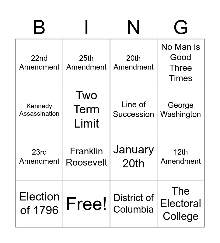 This bingo card has 16 words: Free!, 12th Amendment, 20th Amendment, 22nd Amendment, 23rd Amendment, 25th Amendment, January 20th, District of Columbia, Kennedy Assassination, Two Term Limit, Election of 1796, No Man is Good Three Times, Franklin Roosevelt, George Washington, Line of Succession and The Electoral College.