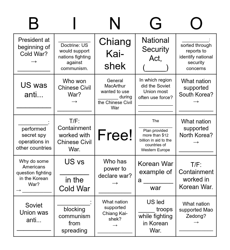 This bingo card has a free space and 24 words: US vs _______ in the Cold War, __________: blocking communism from spreading, General MacArthur wanted to use ________ during the Chinese Civil War, Soviet Union was anti... __________, __________: sorted through reports to identify national security concerns, President at beginning of Cold War? → __________, US was anti... ________, ____________ Doctrine: US would support nations fighting against communism., The _______________ Plan provided more than $12 billion in aid to the countries of Western Europe, Who has power to declare war? → __________, In which region did the Soviet Union most often use force? _____________ _____________, __________: performed secret spy operations in other countries, Korean War example of a ________ war, T/F: Containment worked in Korean War., Who won Chinese Civil War? → ___________, US led _____ troops while fighting in Korean War., What nation supported North Korea? → ___________, Chiang Kai-shek, What nation supported South Korea? → ___________, T/F: Containment worked with Chinese Civil War., What nation supported Mao Zedong? → ____________, Why do some Americans question fighting in the Korean War? → ___________, National Security Act, (_____) and What nation supported Chiang Kai-shek? → _____________.