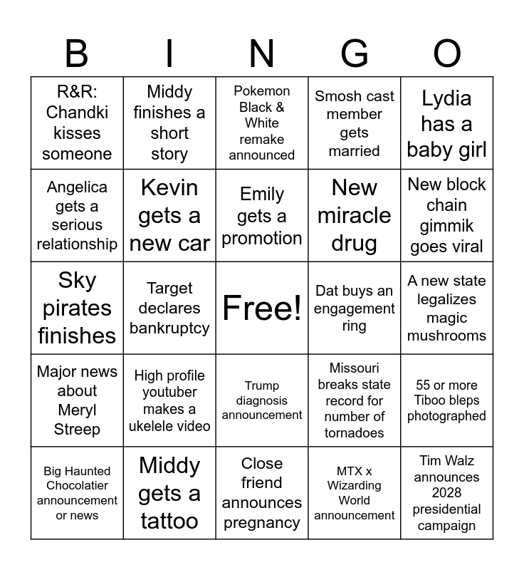 This bingo card has a free space and 24 words: High profile youtuber makes a ukelele video, Middy gets a tattoo, Emily gets a promotion, Big Haunted Chocolatier announcement or news, Lydia has a baby girl, R&R: Chandki kisses someone, Angelica gets a serious relationship, Middy finishes a short story, Dat buys an engagement ring, Trump diagnosis announcement, New miracle drug, Sky pirates finishes, Missouri breaks state record for number of tornadoes, 55 or more Tiboo bleps photographed, Kevin gets a new car, MTX x Wizarding World announcement, A new state legalizes magic mushrooms, Pokemon Black & White remake announced, New block chain gimmik goes viral, Target declares bankruptcy, Tim Walz announces 2028 presidential campaign, Major news about Meryl Streep, Smosh cast member gets married and Close friend announces pregnancy.