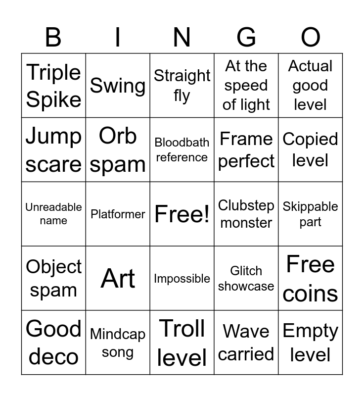 This bingo card has a free space and 24 words: Art, Mindcap song, Bloodbath reference, Good deco, Actual good level, Triple Spike, Jump scare, Swing, Clubstep monster, Impossible, Frame perfect, Unreadable name, Glitch showcase, Free coins, Orb spam, Wave carried, Skippable part, Straight fly, Copied level, Platformer, Empty level, Object spam, At the speed of light and Troll level.