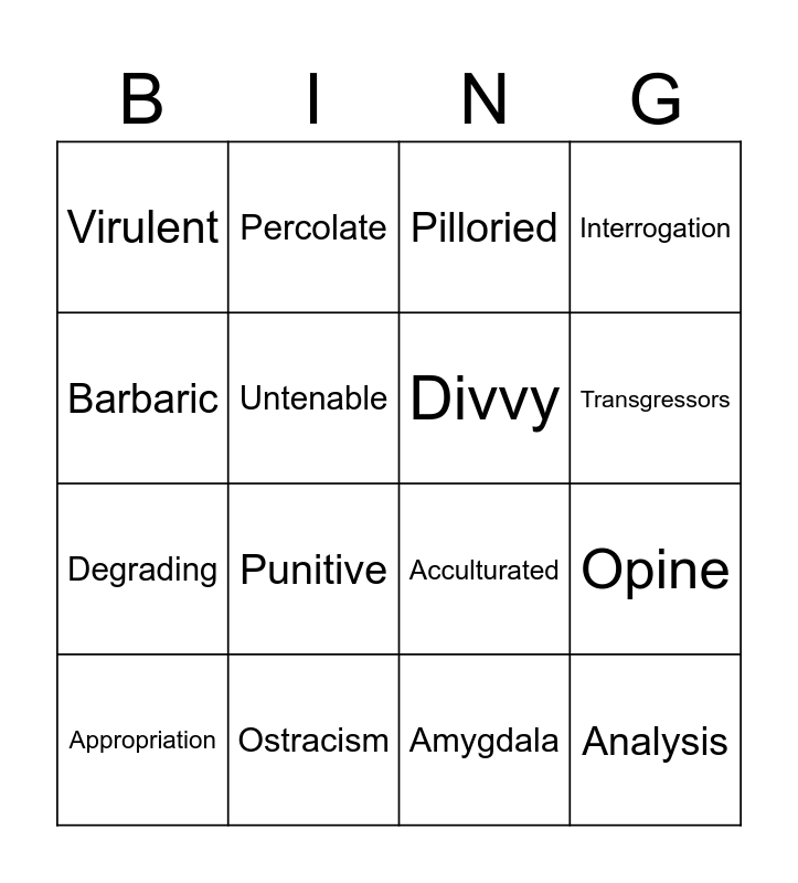 This bingo card has 20 words: Opine, Myriad, Pilloried, Transmute, Appropriation, Barbaric, Ostracism, Virulent, Degrading, Percolate, Punitive, Acculturated, Untenable, Analysis, Divvy, Censure, Transgressors, Interrogation, Amygdala and Ameliorate.
