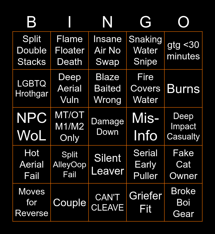 This bingo card has a free space and 24 words: Split AlleyOop Fail, Couple, Blaze Baited Wrong, Moves for Reverse, gtg <30 minutes, Split Double Stacks, LGBTQ Hrothgar, Flame Floater Death, Mis- Info, Silent Leaver, Fire Covers Water, NPC WoL, Serial Early Puller, Fake Cat Owner, Deep Aerial Vuln, Griefer Fit, Deep Impact Casualty, Insane Air No Swap, Burns, MT/OT M1/M2 Only, Broke Boi Gear, Hot Aerial Fail, Snaking Water Snipe and CAN'T CLEAVE.