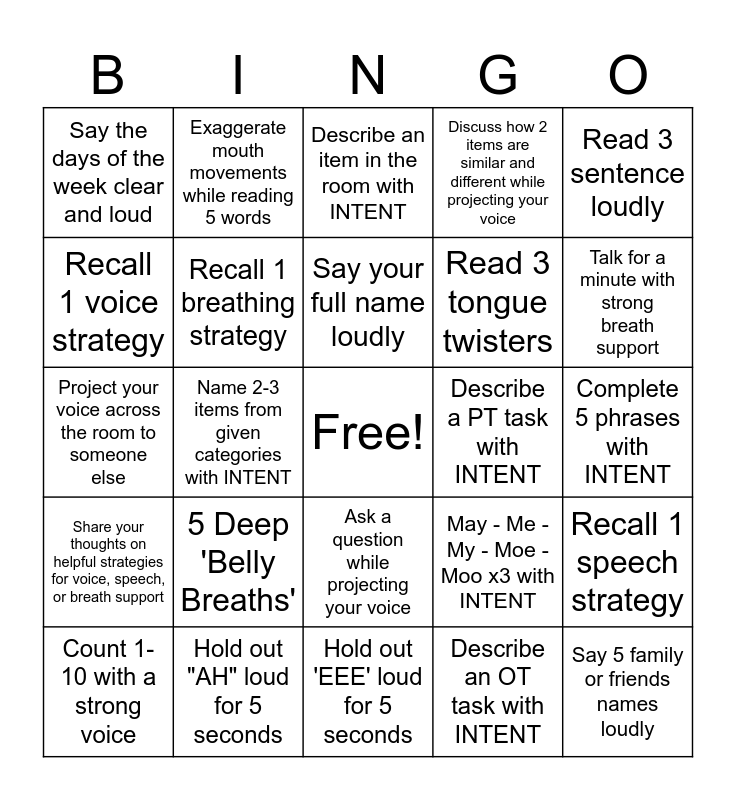 This bingo card has a free space and 24 words: 5 Deep 'Belly Breaths', Hold out "AH" loud for 5 seconds, Say your full name loudly, Count 1-10 with a strong voice, Read 3 sentence loudly, Say the days of the week clear and loud, Recall 1 voice strategy, Exaggerate mouth movements while reading 5 words, Describe a PT task with INTENT, Ask a question while projecting your voice, Read 3 tongue twisters, Project your voice across the room to someone else, May - Me - My - Moe - Moo x3 with INTENT, Recall 1 speech strategy, Recall 1 breathing strategy, Describe an OT task with INTENT, Complete 5 phrases with INTENT, Describe an item in the room with INTENT, Talk for a minute with strong breath support, Name 2-3 items from given categories with INTENT, Say 5 family or friends names loudly, Share your thoughts on helpful strategies for voice, speech, or breath support, Discuss how 2 items are similar and different while projecting your voice and Hold out 'EEE' loud for 5 seconds.