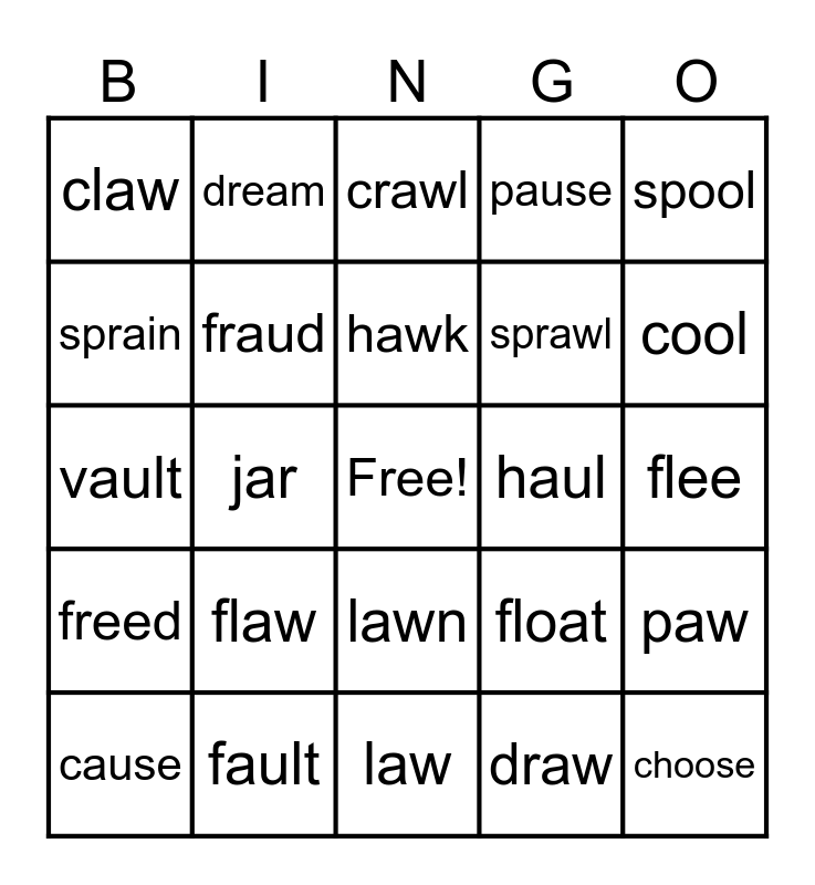 This bingo card has a free space and 34 words: yawn, draw, loan, stool, freed, fraud, spool, cause, dream, shawl, hawk, crawl, drawn, flow, haul, cool, fault, vault, flaw, float, lawn, straw, claw, flee, law, choose, pause, thaw, sprawl, sprain, jaw, jar, paw and launch.