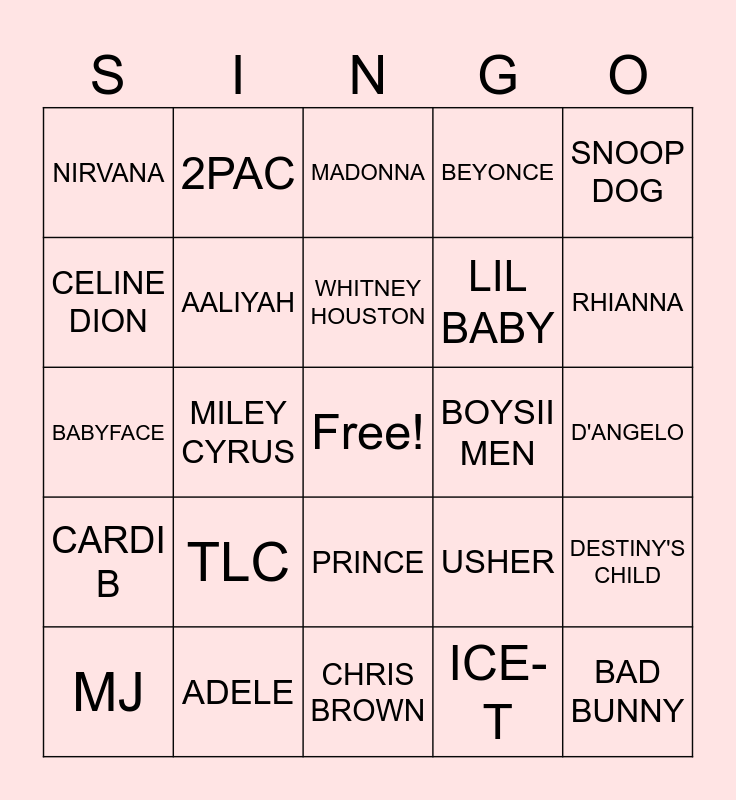 This bingo card has a free space and 24 words: MJ, TLC, WHITNEY HOUSTON, ICE-T, SNOOP DOG, NIRVANA, 2PAC, MADONNA, BOYSII MEN, D'ANGELO, BABYFACE, AALIYAH, USHER, DESTINY'S CHILD, CELINE DION, ADELE, CHRIS BROWN, BEYONCE, RHIANNA, CARDI B, MILEY CYRUS, PRINCE, LIL BABY and BAD BUNNY.