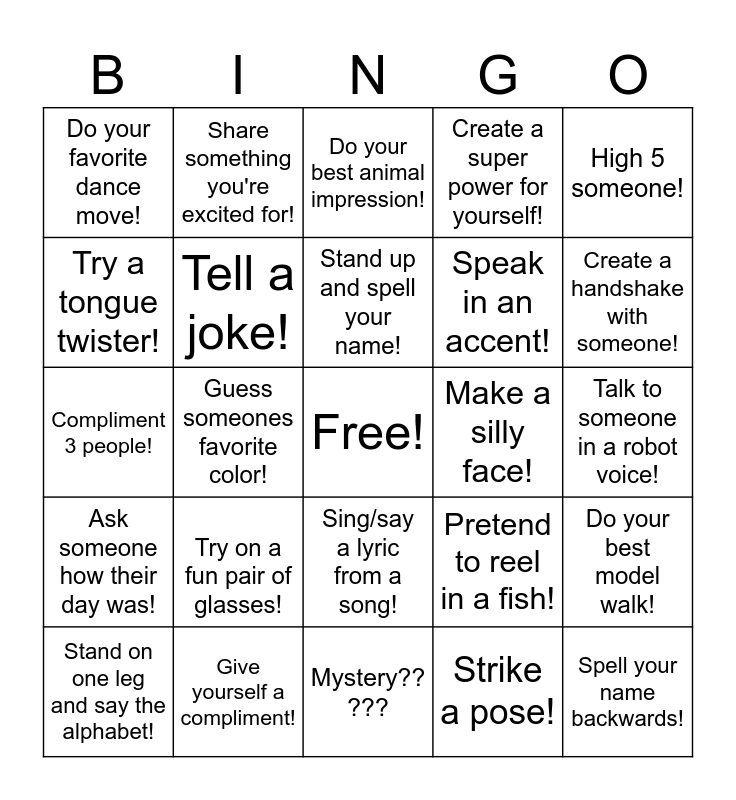This bingo card has a free space and 24 words: Try on a fun pair of glasses!, Give yourself a compliment!, Stand up and spell your name!, Stand on one leg and say the alphabet!, High 5 someone!, Do your favorite dance move!, Try a tongue twister!, Share something you're excited for!, Make a silly face!, Sing/say a lyric from a song!, Speak in an accent!, Compliment 3 people!, Pretend to reel in a fish!, Do your best model walk!, Tell a joke!, Strike a pose!, Talk to someone in a robot voice!, Do your best animal impression!, Create a handshake with someone!, Guess someones favorite color!, Spell your name backwards!, Ask someone how their day was!, Create a super power for yourself! and Mystery?? ???.