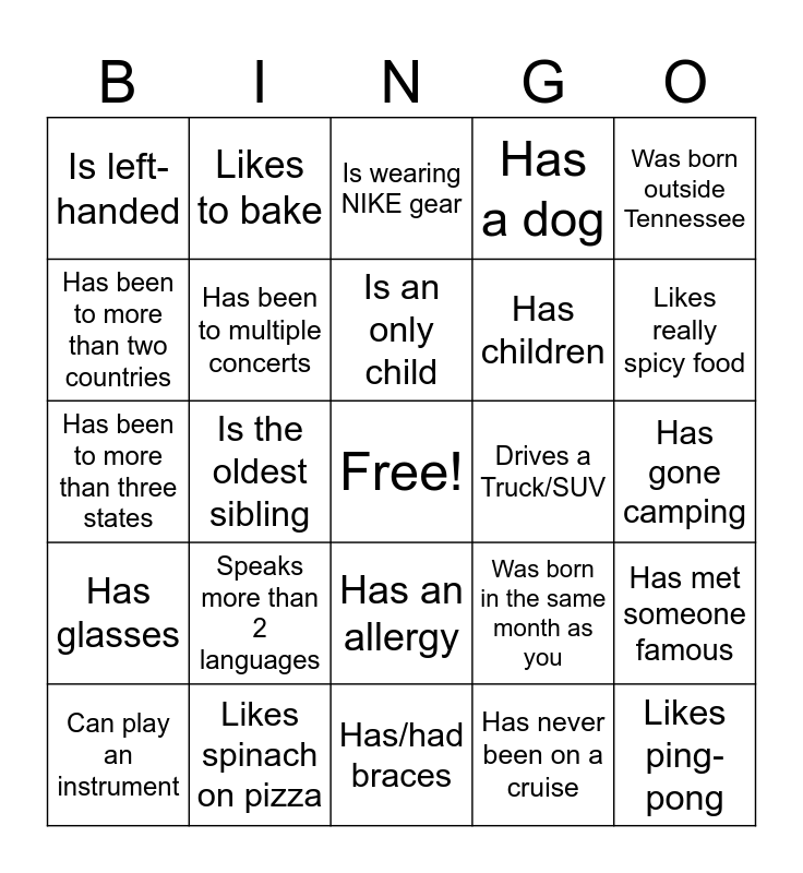 This bingo card has a free space and 24 words: Speaks more than 2 languages, Likes spinach on pizza, Is an only child, Can play an instrument, Was born outside Tennessee, Is left-handed, Has been to more than two countries, Likes to bake, Drives a Truck/SUV, Has an allergy, Has children, Has been to more than three states, Was born in the same month as you, Has met someone famous, Has been to multiple concerts, Has never been on a cruise, Has gone camping, Is wearing NIKE gear, Likes really spicy food, Is the oldest sibling, Likes ping- pong, Has glasses, Has a dog and Has/had braces.