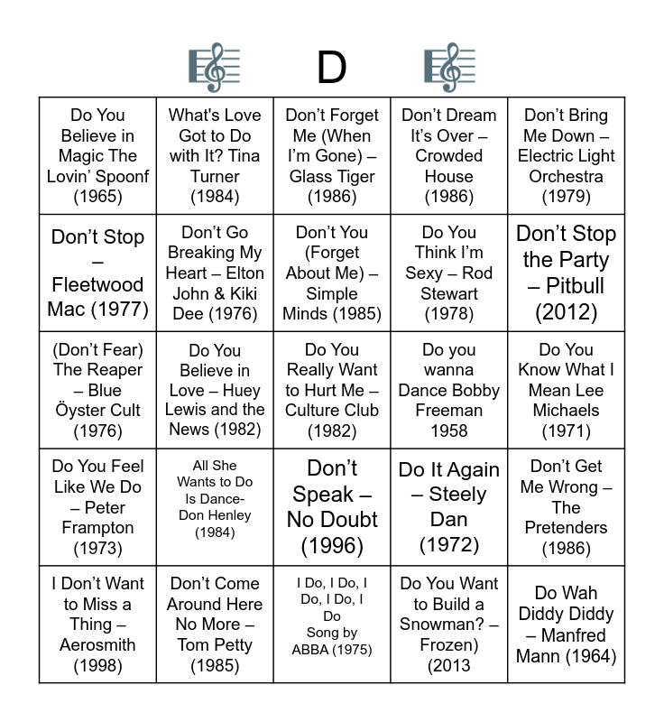 This bingo card has 35 words: Don’t Stop Believin’ – Journey (1981), Don’t Stop Me Now – Queen (1979), Don’t Worry, Be Happy – Bobby McFerrin (1988), Don’t Go Breaking My Heart – Elton John & Kiki Dee (1976), Don’t Speak – No Doubt (1996), Don’t Dream It’s Over – Crowded House (1986), Don’t Stop – Fleetwood Mac (1977), Don’t Stop ’Til You Get Eno– Michael Jackson (1979), Don’t You (Forget About Me) – Simple Minds (1985), Don’t Worry Baby – The Beach Boys (1964), (Don’t Fear) The Reaper – Blue Öyster Cult (1976), Don’t Bring Me Down – Electric Light Orchestra (1979), Don’t Start Now – Dua Lipa (2019), Do You Love Me – The Contours (1962), Do You Believe in Magic The Lovin’ Spoonf (1965), Do you wanna Dance Bobby Freeman 1958, Do You Want to Build a Snowman? – Frozen) (2013, Do You Believe in Love – Huey Lewis and the News (1982), Do You Feel Like We Do – Peter Frampton (1973), Do You Really Want to Hurt Me – Culture Club (1982), Do It Again – Steely Dan (1972), I Don’t Want to Miss a Thing – Aerosmith (1998), Don’t Get Me Wrong – The Pretenders (1986), Don’t Come Around Here No More – Tom Petty (1985), Don’t Forget Me (When I’m Gone) – Glass Tiger (1986), Don’t Stop the Party – Pitbull (2012), Do Wah Diddy Diddy – Manfred Mann (1964), Do Me! – Bell Biv DeVoe (1990), Do You Think I’m Sexy – Rod Stewart (1978), Do You Know What I Mean Lee Michaels (1971), De Do Do Song by The Police ‧ (1980), I Do, I Do, I Do, I Do, I Do Song by ABBA (1975), All She Wants to Do Is Dance- Don Henley (1984), What's Love Got to Do with It? Tina Turner (1984) and All I have to do is dream Everly Brothers ‧ (1958).