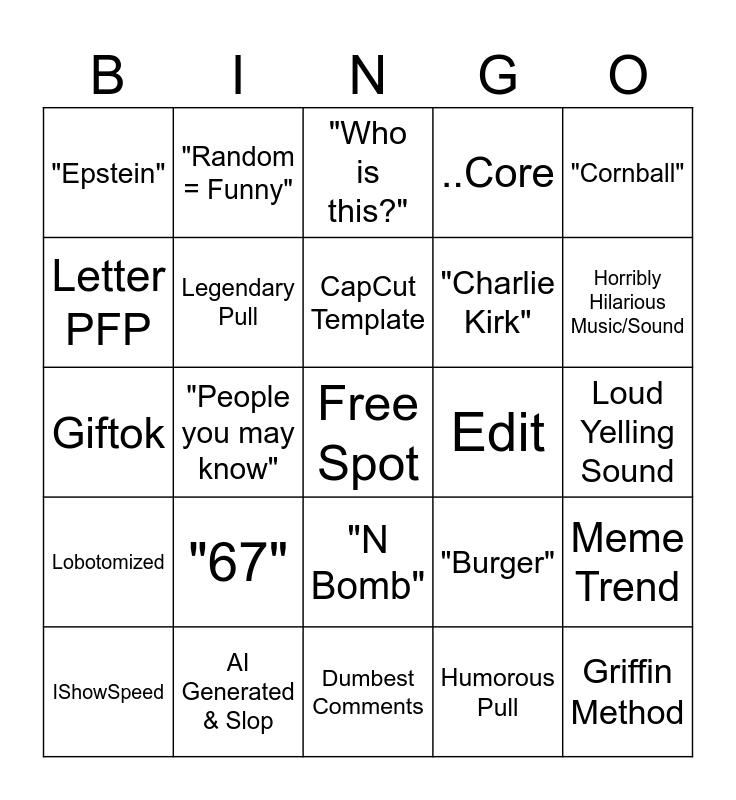 This bingo card has a free space and 24 words: "67", AI Generated & Slop, CapCut Template, IShowSpeed, "Cornball", "Epstein", Letter PFP, "Random = Funny", Edit, "N Bomb", "Charlie Kirk", Giftok, "Burger", Meme Trend, Legendary Pull, Humorous Pull, Loud Yelling Sound, "Who is this?", Horribly Hilarious Music/Sound, "People you may know", Griffin Method, Lobotomized, ..Core and Dumbest Comments.