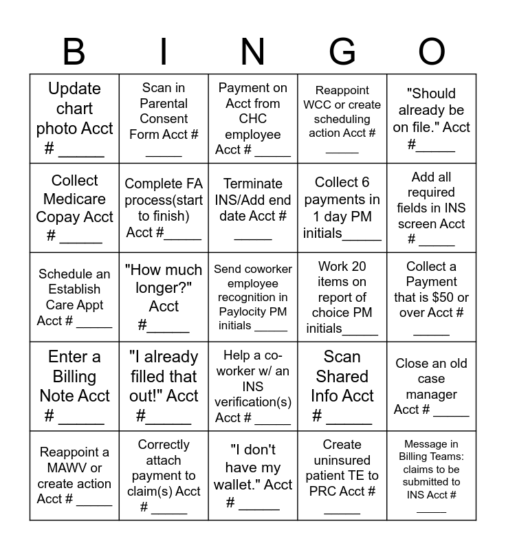 This bingo card has a free space and 24 words: "I already filled that out!" Acct #_____, Correctly attach payment to claim(s) Acct # _____, Terminate INS/Add end date Acct # _____, Reappoint a MAWV or create action Acct # _____, "Should already be on file." Acct #_____, Update chart photo Acct # _____, Collect Medicare Copay Acct # _____, Scan in Parental Consent Form Acct # _____, Work 20 items on report of choice PM initials_____, Help a co-worker w/ an INS verification(s) Acct # _____, Collect 6 payments in 1 day PM initials_____, Schedule an Establish Care Appt Acct # _____, Scan Shared Info Acct # _____, Close an old case manager Acct # _____, Complete FA process(start to finish) Acct #_____, Create uninsured patient TE to PRC Acct # _____, Collect a Payment that is $50 or over Acct # _____, Payment on Acct from CHC employee Acct # _____, Add all required fields in INS screen Acct # _____, "How much longer?" Acct #_____, Message in Billing Teams: claims to be submitted to INS Acct # _____, Enter a Billing Note Acct # _____, Reappoint WCC or create scheduling action Acct # _____ and "I don't have my wallet." Acct # _____.