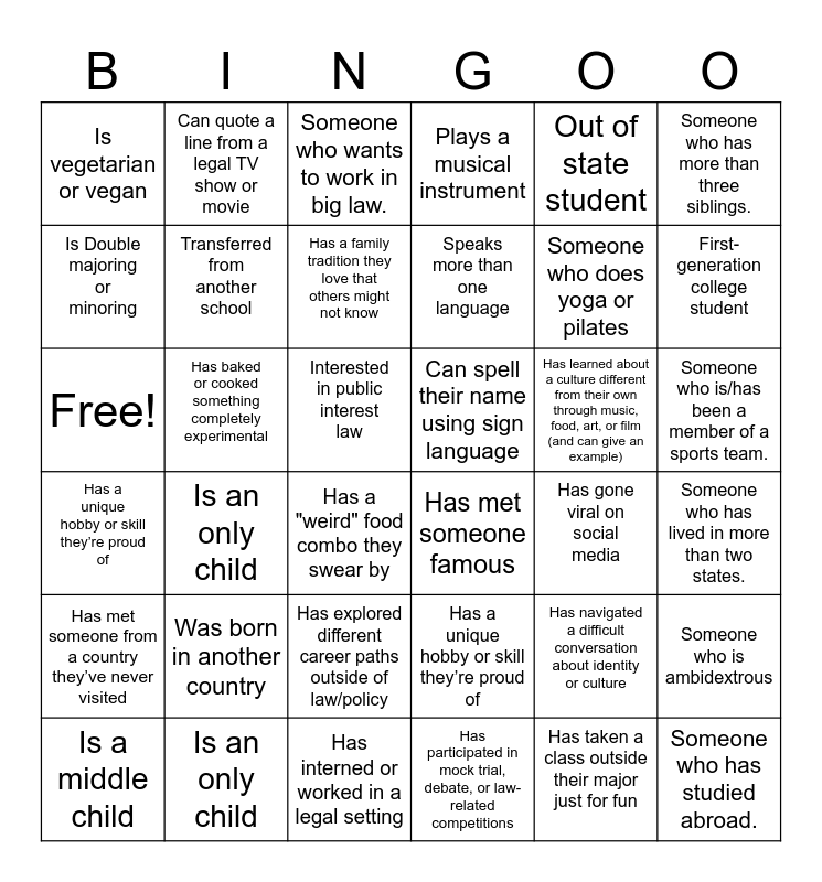 This bingo card has 36 words: Has a unique hobby or skill they’re proud of, Has explored different career paths outside of law/policy, Has participated in mock trial, debate, or law-related competitions, Is Double majoring or minoring, Has a unique hobby or skill they’re proud of, Can spell their name using sign language, Transferred from another school, Has interned or worked in a legal setting, Out of state student, Has navigated a difficult conversation about identity or culture, First-generation college student, Plays a musical instrument, Someone who is ambidextrous, Has baked or cooked something completely experimental, Speaks more than one language, Is vegetarian or vegan, Has met someone from a country they’ve never visited, Has learned about a culture different from their own through music, food, art, or film (and can give an example), Free!, Someone who wants to work in big law., Interested in public interest law, Is an only child, Has met someone famous, Has a "weird" food combo they swear by, Has gone viral on social media, Can quote a line from a legal TV show or movie, Someone who does yoga or pilates, Is an only child, Has a family tradition they love that others might not know, Someone who has more than three siblings., Someone who has studied abroad., Is a middle child, Someone who has lived in more than two states., Someone who is/has been a member of a sports team., Was born in another country and Has taken a class outside their major just for fun.