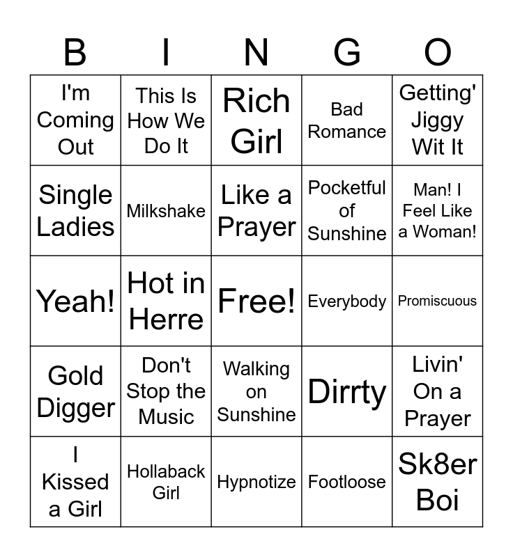 This bingo card has a free space and 87 words: Get the Party Started, Rock Your Body, Walking on Sunshine, Girls Just Want to Have Fun, Don’t Cha, Genie In a Bottle, Raise Your Glass, Hips Don't Lie, Jenny from the Block, You Give Love a Bad Name, I'm So Excited, I'll Be There for You, Livin' On a Prayer, Promiscuous, The Sign, Like a Prayer, I Wanna Dance with Somebody, Let's Get It Started, 1, 2 Step, The Real Slim Shady, Play That Funky Music, Paparazzi, Yeah!, Party in the U.S.A., Footloose, Uptown Girl, Since U Been Gone, Umbrella, Celebration, Uptown Funk, Hollaback Girl, Pon de Replay, Toxic, Don't Stop the Music, Single Ladies, Temperature, Man! I Feel Like a Woman!, Dropp t Like It's Hot, Survivor, Hot in Herre, No Scrubs, Jumpiin' Jumpin', Bye Bye Bye, Everybody, Miami, Getting' Jiggy Wit It, Say My Name, This Is How We Do It, Do Diggity, Wannabe, Crazy in Love, I Want You Back, Gold Digger, Oops! I Did It Again, Get Busy, Maria Maria, Pocketful of Sunshine, Poison, Unwritten, Bad Romance, Milkshake, Tik Tok, I Gotta Feeling, Just Dance, Low, In Da Club, Last Friday Night, I Kissed a Girl, Sk8er Boi, Like a Boy, Dynamite, Get Ur Freak On, Rich Girl, Dirrty, California Love, Hip Hop Hooray, The Next Episode, Hypnotize, Run the World, Confident, Sit Still, Look Pretty, Titanium, 9 to 5, Respect, She Works Hard for the Money, I'm Coming Out and Let's Get Loud.