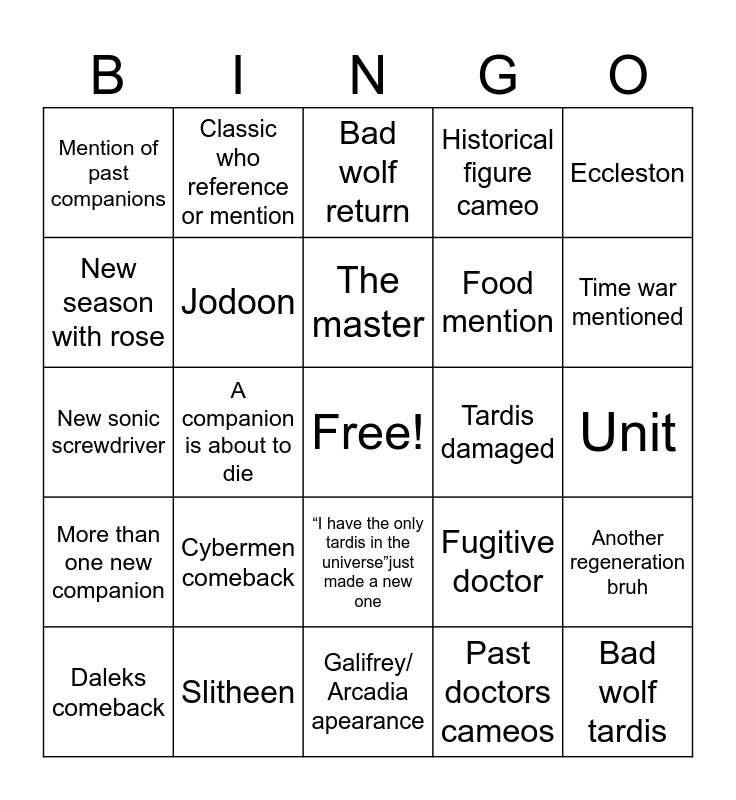 This bingo card has a free space and 24 words: Daleks comeback, Cybermen comeback, The master, Past doctors cameos, Eccleston, Mention of past companions, Classic who reference or mention, Bad wolf return, Tardis damaged, Unit, New sonic screwdriver, Jodoon, Fugitive doctor, Another regeneration bruh, New season with rose, Slitheen, Galifrey/ Arcadia apearance, Historical figure cameo, Time war mentioned, More than one new companion, A companion is about to die, “I have the only tardis in the universe”just made a new one, Food mention and Bad wolf tardis.