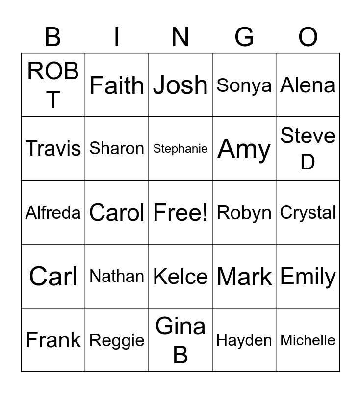 This bingo card has a free space and 98 words: Rhonda, Rusty, Chason, Crystal, Tyler, Jessica, Miguel, Lucy, Blake, Abbey, Q, Matt, Jesse, Nathan, Talia, Faith, Alfreda, Linda, Luke, Ryan, Kaniya, Julian Gale, Julian Weaver, Irene, Lisa, ROB T, Gina B, Gerald, Jamilah, Nita, Frank, Travis, Rachel, Tammy, Steve D, Kathy D, Sonya, David, Carol, Eustace, Clay, Stephanie, Amy, Johanna, Yvonne, Kelce, Carrie, Vivan, Jane, Mike K, Teresa, Mike G, Kathy G, Debbie, Gene, Marilyn, Carl, Nancy, Penny, Owen, Phu, Tabor, Hunter, Mediea, Gina H, Jaci, Caleb, Ashley, Shawn, Christy, Josh, Trista, Hayden, Joseph, Carmine, Rylee, Bob, Woody, Philip, Michelle, Byron, Sharon, Reggie, Omega, Mike, Brenda, Japheth, Stephen, Emily, Paola, Michael, Mark, Darlene, Eva, Robyn, Jenny, Alena and Steve L.