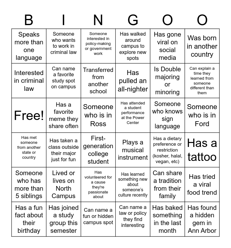 This bingo card has 36 words: Has learned something new about someone’s culture recently, Has volunteered for a cause they're passionate about, Can name a law or policy they find interesting, Interested in criminal law, Has met someone from another state or country, Has attended a student performance at the Power Center, Can name a favorite study spot on campus, Can name a fun or hidden campus spot, Has gone viral on social media, Can share a tradition from their family, Can explain a time they learned from someone different than them, Has walked around campus to explore new spots, Has tried a viral food trend, Has a favorite meme they share often, Has pulled an all-nighter, Speaks more than one language, Someone who has more than 5 siblings, Someone who knows sign language, Free!, Someone interested in policy-making or government work, Someone who is in Ross, Has taken a class outside their major just for fun, Plays a musical instrument, First- generation college student, Has a dietary preference or restriction (kosher, halal, vegan, etc), Someone who wants to work in criminal law, Is Double majoring or minoring, Has joined a study group this semester, Transferred from another school, Was born in another country, Has found a hidden gem in Ann Arbor, Has a fun fact about their birthday, Has a tattoo, Someone who is in Ford, Lived or lives on North Campus and Has baked something in the last month.