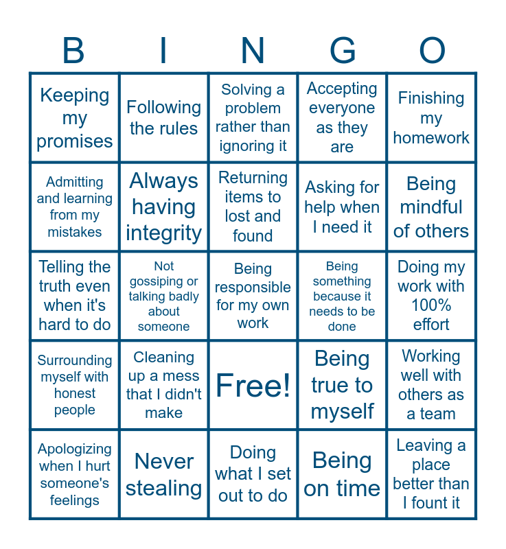 This bingo card has a free space and 26 words: Free!, Being on time, Returning items to lost and found, Never stealing, Finishing my homework, Keeping my promises, Admitting and learning from my mistakes, Following the rules, Doing my work with 100% effort, Being true to myself, Asking for help when I need it, Telling the truth even when it's hard to do, Working well with others as a team, Apologizing when I hurt someone's feelings, Not gossiping or talking badly about someone, Not cutting corners, Accepting everyone as they are, Surrounding myself with honest people, Solving a problem rather than ignoring it, Leaving a place better than I fount it, Being mindful of others, Doing what I set out to do, Being something because it needs to be done, Cleaning up a mess that I didn't make, Always having integrity and Being on time, Returning items to lost and found, Never stealing, Finishing my homework, Keeping my promises, Admitting and learning from my mistakes, Following the rules, Doing my work with 100% effort, Being true to myself, Asking for help when.