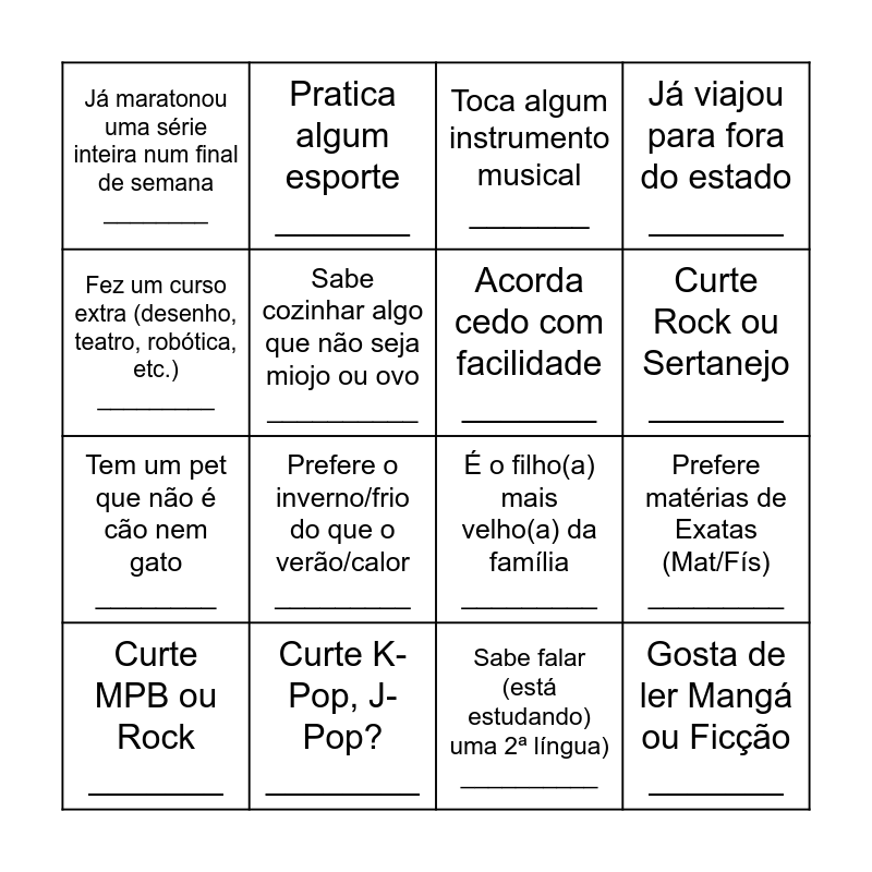 This bingo card has 16 words: Curte K-Pop, J-Pop? ________, Prefere matérias de Exatas (Mat/Fís) _________, Toca algum instrumento musical _______, Já maratonou uma série inteira num final de semana ________, Tem um pet que não é cão nem gato ________, Pratica algum esporte _______, É o filho(a) mais velho(a) da família _________, Sabe falar (está estudando) uma 2ª língua) __________, Fez um curso extra (desenho, teatro, robótica, etc.) _________, Sabe cozinhar algo que não seja miojo ou ovo __________, Curte MPB ou Rock _______, Já viajou para fora do estado _______, Prefere o inverno/frio do que o verão/calor _________, Curte Rock ou Sertanejo _______, Acorda cedo com facilidade _______ and Gosta de ler Mangá ou Ficção _______.