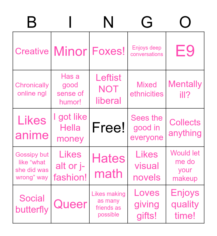 This bingo card has a free space and 24 words: Likes alt or j-fashion!, Queer, Leftist NOT liberal, Social butterfly, E9, Creative, Chronically online ngl, Minor, Sees the good in everyone, Hates math, Mixed ethnicities, Likes anime, Likes visual novels, Would let me do your makeup, Has a good sense of humor!, Loves giving gifts!, Collects anything, Foxes!, Mentally ill?, I got like Hella money, Enjoys quality time!, Gossipy but like “what she did was wrong” way, Enjoys deep conversations and Likes making as many friends as possible.