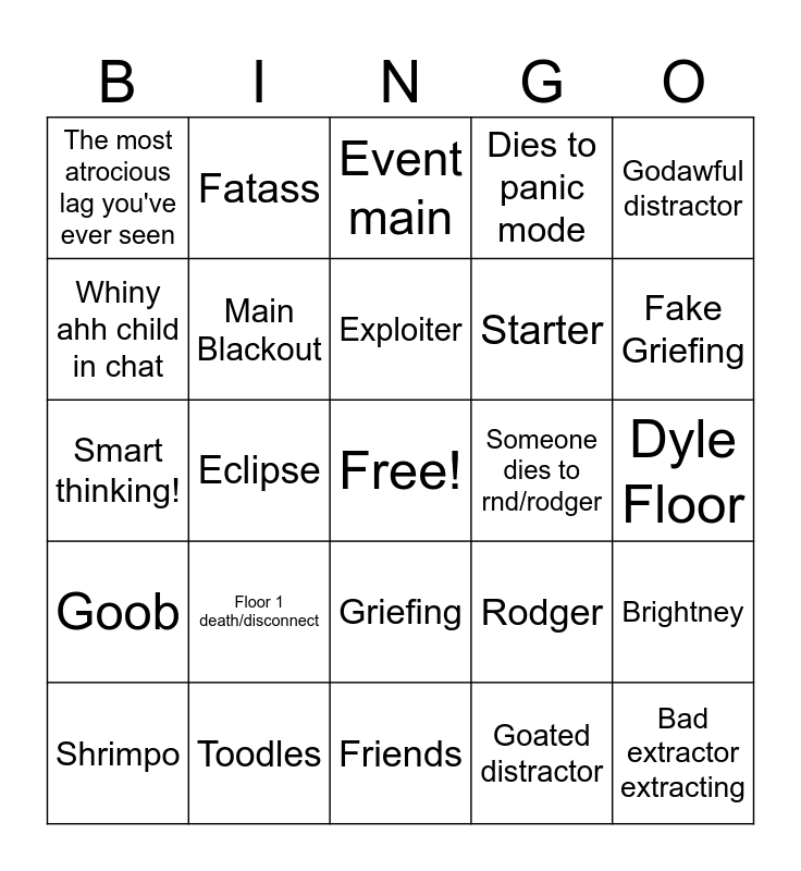 This bingo card has a free space and 24 words: Floor 1 death/disconnect, Toodles, Exploiter, Shrimpo, Godawful distractor, The most atrocious lag you've ever seen, Whiny ahh child in chat, Fatass, Someone dies to rnd/rodger, Griefing, Starter, Smart thinking!, Rodger, Brightney, Main Blackout, Goated distractor, Dyle Floor, Event main, Fake Griefing, Eclipse, Bad extractor extracting, Goob, Dies to panic mode and Friends.