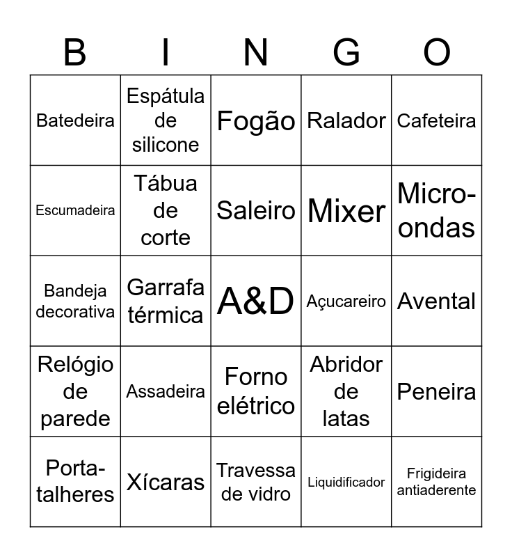This bingo card has a free space and 50 words: Panela de pressão, Frigideira antiaderente, Jogo de panelas, Travessa de vidro, Assadeira, Forma de bolo, Espátula de silicone, Colher de pau, Escumadeira, Concha, Tábua de corte, Ralador, Peneira, Abridor de latas, Saca-rolhas, Porta-temperos, Saleiro, Açucareiro, Bule, Cafeteira, Garrafa térmica, Liquidificador, Batedeira, Mixer, Processador, Torradeira, Micro-ondas, Geladeira, Fogão, Forno elétrico, Jogo de pratos, Faqueiro, Jogo de copos, Taças, Xícaras, Jogo americano, Toalha de mesa, Guardanapos de tecido, Pano de prato, Avental, Luva térmica, Lixeira inox, Organizador de gaveta, Potes herméticos, Porta-talheres, Bandeja decorativa, Centro de mesa, Vaso de flores, Relógio de parede and Kit churrasco.