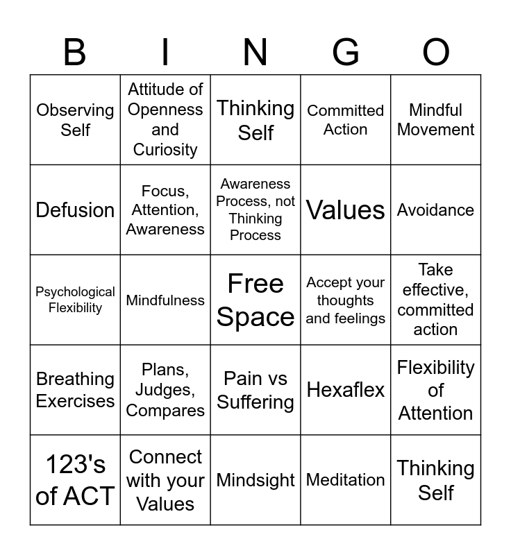 This bingo card has a free space and 29 words: 123's of ACT, Contact with the Present Moment, Mindfulness, Acceptance, Observing Self, Thinking Self, Focus, Attention, Awareness, Plans, Judges, Compares, Accept your thoughts and feelings, Connect with your Values, Take effective, committed action, Thinking Self, Mindsight, Meditation, Avoidance, ACT, Pain vs Suffering, Breathing Exercises, Mindful Movement, Psychological Flexibility, Hexaflex, Self-as-Context, Values, Defusion, Committed Action, Attitude of Openness and Curiosity, Flexibility of Attention, Awareness Process, not Thinking Process and 8 Steps.