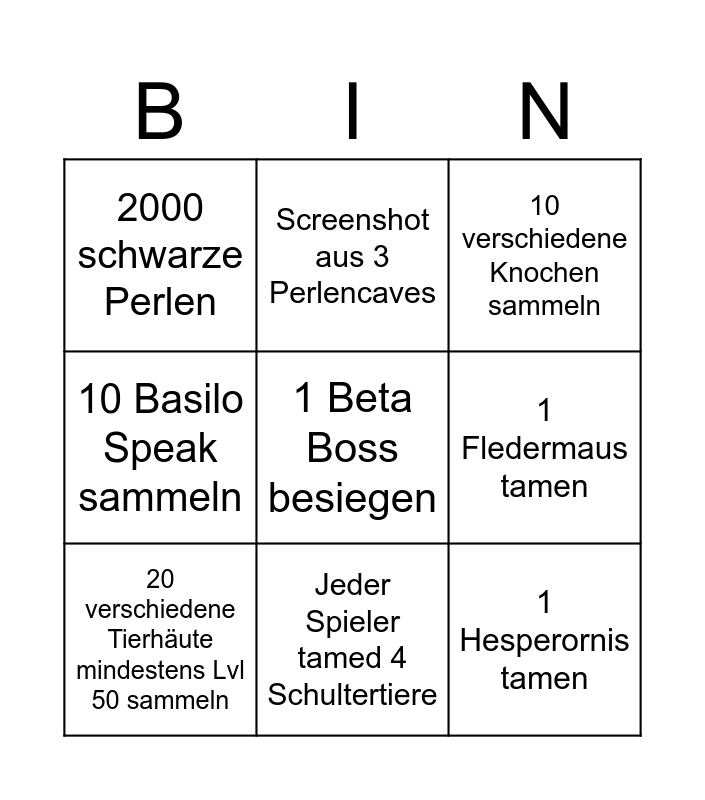 This bingo card has a free space and 8 words: 1 Fledermaus tamen, 10 verschiedene Knochen sammeln, Screenshot aus 3 Perlencaves, 20 verschiedene Tierhäute mindestens Lvl 50 sammeln, 2000 schwarze Perlen, 1 Hesperornis tamen, 10 Basilo Speak sammeln and Jeder Spieler tamed 4 Schultertiere.