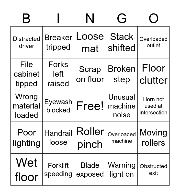 This bingo card has a free space and 29 words: Wet floor, Rushed task, Eyewash blocked, Sharp edge exposed, Distracted driver, Loose mat, Forks left raised, Handrail loose, Unusual machine noise, Forklift speeding, Horn not used at intersection, Obstructed exit, Blade exposed, Warning light on, Floor clutter, Loose extension cord, Roller pinch, Poor lighting, Overloaded outlet, Wrong material loaded, Overloaded machine, Cart rolled, Broken step, File cabinet tipped, Stack shifted, Breaker tripped, Moving rollers, Scrap on floor and Blade slipped.