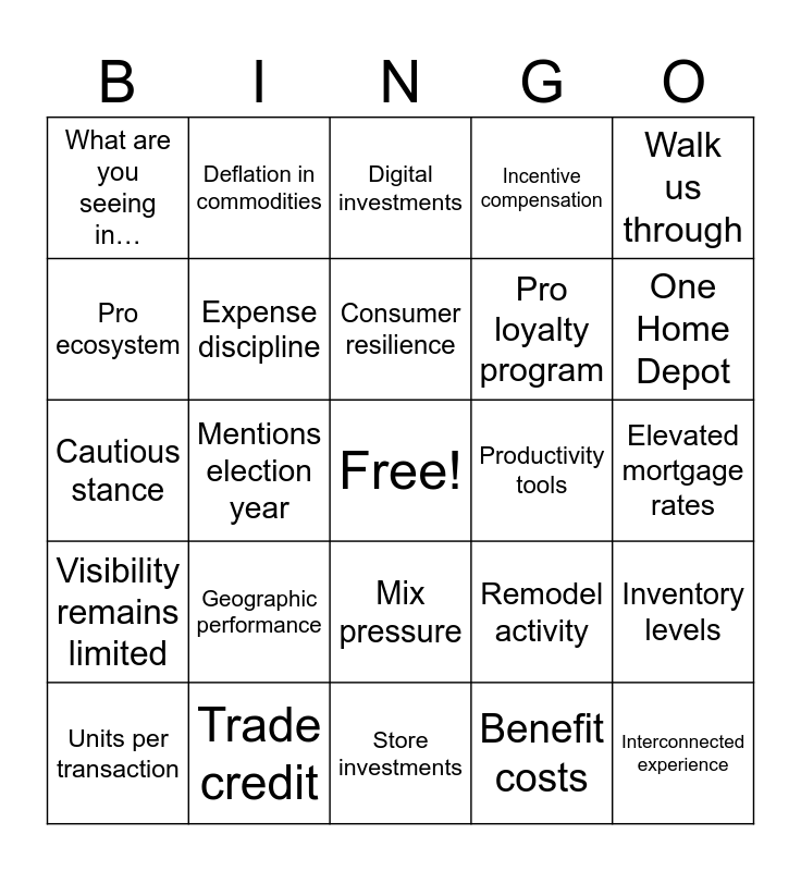 This bingo card has a free space and 168 words: Macro uncertainty, Macro headwinds, Macroeconomic environment, Consumer pressure, Consumer resilience, Consumer confidence, Discretionary spending pressure, Interest rate environment, Higher for longer, Housing market softness, Housing turnover, Existing home sales, Elevated mortgage rates, Inflationary pressures, Deflation in commodities, Weather impact, Seasonal normalization, Lapping stimulus, Post-pandemic normalization, Demand moderation, Demand environment, Economic backdrop, Comparable sales, Comp sales decline, Positive comps, Traffic vs ticket, Average ticket, Customer transactions, Big ticket transactions, Pro customer growth, DIY customer softness, Transaction counts, Units per transaction, Category performance, Geographic performance, Sales cadence, Sales trends, Sequential improvement, Quarter-to-date trends, Back half of the year, First half / second half dynamic, Revenue guidance, Pro ecosystem, Pro penetration, Pro wallet share, Complex Pro, Pro backlogs, Pro demand resilience, Pro loyalty program, Job site delivery, Trade credit, Professional contractor, Smaller Pro, Remodel activity, Gross margin, Gross margin expansion, Gross margin pressure, Operating margin, Operating leverage, EBIT margin, SG&A leverage, Expense discipline, Productivity initiatives, Cost discipline, Cost structure, Expense headwinds, Commodity tailwinds, Supply chain efficiencies, Shrink, Inventory shrink, Markdowns, Mix pressure, Inventory levels, Inventory normalization, Inventory discipline, Supply chain modernization, Interconnected retail, Distribution center, Fulfillment capabilities, In-stock position, Lead times, Freight costs, Ocean freight, Vendor partnerships, Working capital, Turn improvement, One Home Depot, Interconnected experience, Digital investments, Technology investments, AI initiatives, Automation, Productivity tools, Store investments, Capital allocation, Strategic priorities, Long-term opportunity, Market share gains, Category adjacencies, Merchandising strategy, Digital penetration, Online sales, BOPIS (Buy Online Pick Up In Store), Curbside pickup, Same-day delivery, Mobile app engagement, Pro digital tools, Omnichannel experience, Digital traffic, Conversion rate, Wage investments, Labor productivity, Associate engagement, Store staffing, Training investments, Benefit costs, Healthcare costs, Incentive compensation, Share repurchase, Dividend increase, CapEx, Free cash flow, Balance sheet strength, Leverage ratio, Liquidity position, Investment-grade rating, Raising guidance, Maintaining guidance, Revising guidance, Conservative outlook, Visibility remains limited, Embedded assumptions, Assumption framework, Continued normalization, Sequential acceleration, Moderation expected, Cautious stance, Expect pressure to continue, Color on that, Can you unpack that?, How should we think about…, Any incremental commentary?, What are you seeing in…, Is that sustainable?, Bridge from Q1 to Q2, Walk us through, Clarify the cadence, Underlying trend, Resilient, Disciplined, Long-term focus, Confident in our strategy, Customer-first, Differentiated model, Strong execution, Competitive positioning, Strategic advantage, Best-in-class, Mentions interest rates 3+ times, Says “resilient” more than 5 times, References hurricanes, Mentions AI explicitly, Blames weather, Mentions geopolitical tension, Says “uncertain environment”, Analyst presses on DIY weakness, Mentions election year and References Lowe’s.