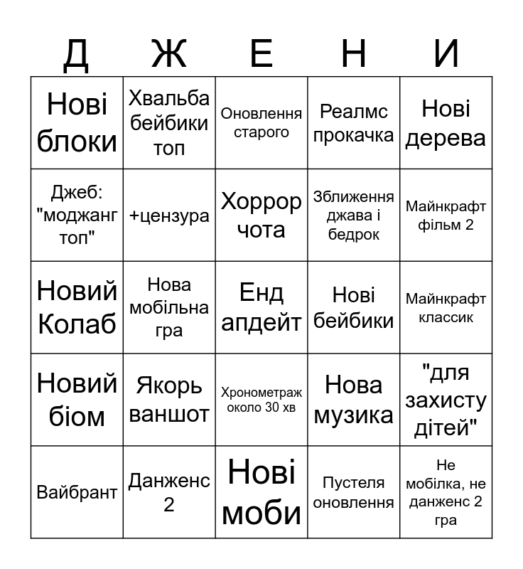 This bingo card has a free space and 24 words: Якорь ваншот, Данженс 2, Хоррор чота, Вайбрант, Нові дерева, Нові блоки, Джеб: "моджанг топ", Хвальба бейбики топ, Нові бейбики, Хронометраж около 30 хв, Зближення джава і бедрок, Новий Колаб, Нова музика, "для захисту дітей", +цензура, Пустеля оновлення, Майнкрафт классик, Оновлення старого, Майнкрафт фільм 2, Нова мобільна гра, Не мобілка, не данженс 2 гра, Новий біом, Реалмс прокачка and Нові моби.
