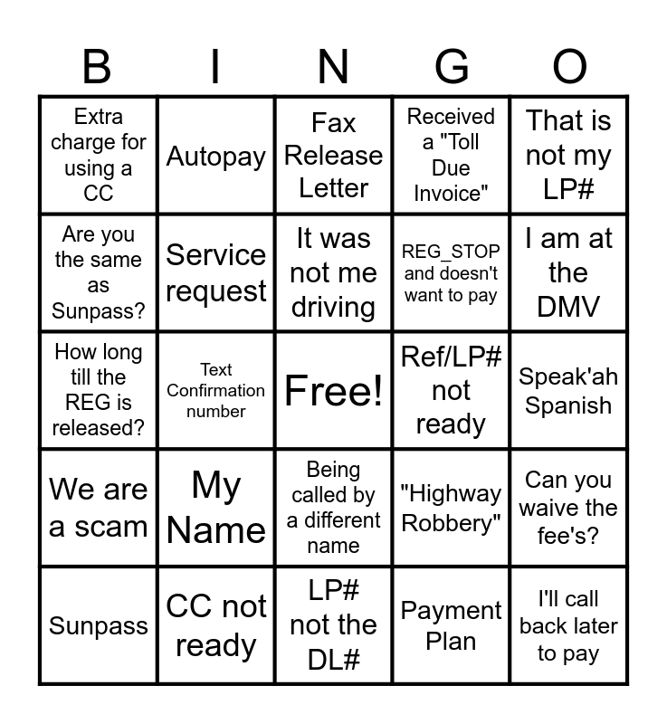 This bingo card has a free space and 24 words: My Name, CC not ready, It was not me driving, Sunpass, That is not my LP#, Extra charge for using a CC, Are you the same as Sunpass?, Autopay, Ref/LP# not ready, Being called by a different name, REG_STOP and doesn't want to pay, How long till the REG is released?, "Highway Robbery", Can you waive the fee's?, Service request, Payment Plan, Speak'ah Spanish, Fax Release Letter, I am at the DMV, Text Confirmation number, I'll call back later to pay, We are a scam, Received a "Toll Due Invoice" and LP# not the DL#.