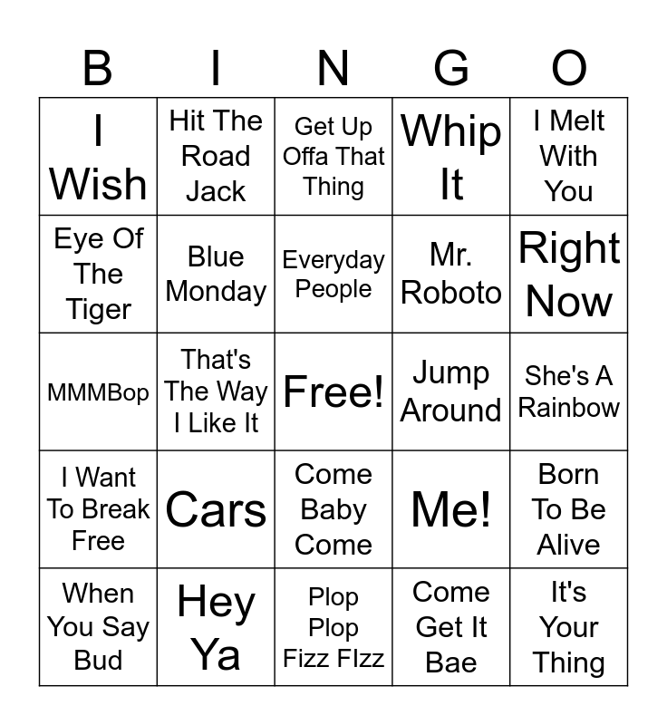 This bingo card has a free space and 38 words: After Midnight, Ain't Nothing Like The Real Thing, Baby Come Back, Blue Monday, Born To Be Alive, Cars, Everyday People, Happy, I Melt With You, Mr. Roboto, That's The Way I Like It, Whip It, It's Your Thing, She's A Rainbow, Eye Of The Tiger, I Want To Break Free, I Want It That Way, Get Up Offa That Thing, EVerybody Wants to Rule The World, Jump Around, I Wish, Hey Ya, Right Now, When You Say Bud, I'd Like The World a Coke, Plop Plop Fizz FIzz, Who Do You Love, Tuesday's Gone, You Don't Mess Around WIth Jim, 24k Magic, A-Punk, Come Baby Come, Come Get It Bae, Hit The Road Jack, I Gotsta Get Paid, Me!, MMMBop and Papa Loves Mambo.