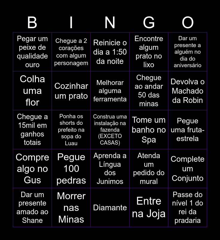 This bingo card has a free space and 24 words: Pegue 100 pedras, Morrer nas Minas, Melhorar alguma ferramenta, Dar um presente amado ao Shane, Dar um presente a alguém no dia do aniversário, Pegar um peixe de qualidade ouro, Colha uma flor, Chegue a 2 corações com algum personagem, Tome um banho no Spa, Aprenda a Língua dos Junimos, Chegue ao andar 50 das minas, Chegue a 15mil em ganhos totais, Atenda um pedido do mural, Complete um Conjunto, Cozinhar um prato, Entre na Joja, Pegue uma fruta-estrela, Reinicie o dia a 1:50 da noite, Devolva o Machado da Robin, Ponha os shorts do prefeito na sopa do Luau, Passe do nível 1 do rei da pradaria, Compre algo no Gus, Encontre algum prato no lixo and Diamante.