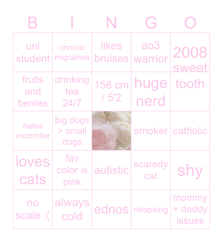 This bingo card has a free space and 24 words: fav color is pink, always cold, 158 cm / 5'2, no scale :(, 2008, uni student, fruits and berries, chronic migraines, smoker, autistic, huge nerd, hates excercise, scaredy cat, shy, drinking tea 24/7, relapsing, catholic, likes bruises, sweet tooth, big dogs > small dogs, mommy + daddy issues, loves cats, ao3 warrior and ednos.