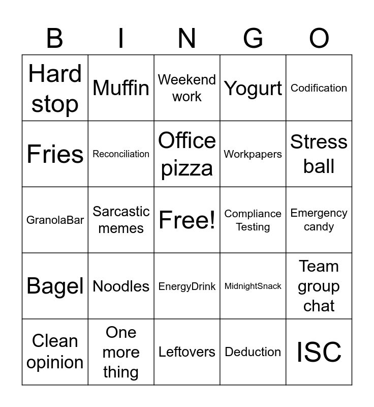 This bingo card has a free space and 150 words: SALY, Auditing, Professional Skepticism, Ledger, Unpredictable, Accrual, Depreciation, Amortization, Materiality, Sampling, Assertions, Independence, Workpapers, Tickmarks, Reconciliation, Trial balance, Audit Adjustments, Disclosures, Consolidation, Impairment, Leases, Revenue, Recognition, Deferred, Audit risk, Controls, Substantive Procedure, Compliance Testing, Tax Filing, Extension, Deduction, Basis, Not material, Withholding, FAR, AUD, REG, BAR, ISC, Becker, Simulation, PBC, Codification, Memorization, Flashcards, Coffee, Espresso, Donuts, Bagel, Pizza, Ramen, EnergyDrink, GranolaBar, Chips, Candy, Chocolate, Pretzels, Popcorn, Burrito, Taco, Sandwich, Noodles, Fries, Nuggets, Smoothie, Yogurt, Muffin, Croissant, Takeout, Leftovers, MidnightSnack, Caffeine, Burnout, Overtime, Deadline, Coffee, Cold brew, Energy drink, Office pizza, Late night snacks, Granola bars, Vending machine, Leftover takeout, Chocolate stash, Emergency candy, Spreadsheet tabs, Pivot tables, Tick and tie, Audit trail, Review notes, Client email, Support request, Open items list, Workpaper comments, Version control, Busy season hoodie, Noise canceling headphones, Blue light glasses, Standing desk, Extra charger, Backup mouse, Portable keyboard, Desk fan, Stress ball, Comfy sneakers, Professional skepticism, Reasonable assurance, Material judgment, Immaterial difference, Passed adjustment, Management explanation, Control walkthrough, Sampling approach, Substantive testing, Rollforward schedule, Calendar blocks, Midnight deadline, Weekend work, Early morning call, Time entry, Charge hours, Utilization stress, Deadline pressure, Hard stop, One more thing, Dark humor, Team group chat, Sarcastic memes, Busy season bingo, Shared suffering, Collective sigh, Nervous laughter, Quiet panic, Mild optimism, End of season hope, Final review, Sign off, Clean opinion, Clearance meeting, Archive files, Post busy nap, Vacation countdown, Out of office, Return to normal, War stories, Cold conference room, Stale donuts, Office fridge, Takeout menus and Caffeine jitters.
