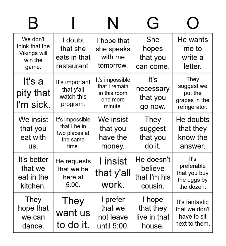 This bingo card has 45 words: He prefers that I speak., We insist that you have the money., I want Juan to study., They hope that we can dance., She requests that y'all serve the coffee., I hope that they live in that house., I hope that she speaks with me tomorrow., I want you to eat the bread., He wants me to write a letter., They want us to do it., She hopes that you can come., They suggest that you do it., I insist that y'all work., He requests that we be here at 5:00., Why do you request that I do it?, I prefer that we not leave until 5:00., She hopes that you know her., We insist that you eat with us., Do you want me to count the money?, They suggest we put the grapes in the refrigerator., I doubt that she eats in that restaurant., They don't believe that he plays the piano., She isn't sure that the coffee is ready., We don't think that the Vikings will win the game., Why don't you believe that we know him?, He doubts that they know the answer., She isn't sure that we always tell the truth., I'm not sure that you can read this., He doesn't believe that I'm his cousin., It's better that we eat in the kitchen., It's necessary that you call them tomorrow., It's preferable that you buy the eggs by the dozen., It's unlikely that they'll be ready by 5:00., It's important that no on knows the secret., It's ridiculous that so many politicians don't tell the truth., It's impossible that I be in two places at the same time., It's incredible that he speaks five languages., It's a shame that ice cream has so many calories., It's fantastic that we don't have to sit next to them., It's impossible that I remain in this room one more minute., It's a pity that I'm sick., It's necessary that you go now., It's better that we eat vegetables., It's important that y'all watch this program. and I think that Juan has the money..