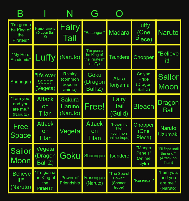 This bingo card has a free space and 56 words: "Rasengan", Sailor Moon, Dragon Ball, "I'm gonna be King of the Pirates!", Attack on Titan, Goku, Naruto, Power of Friendship, Luffy, Sharingan, "Rasengan", Sailor Moon, Free Space, Dragon Ball, "I'm gonna be King of the Pirates!", Attack on Titan, Madara, Tsundere, Kamehameha, Chopper, "Believe it!", Vegeta, Akira Toriyama, Fairy Tail, "I am you, and you are me.", "My Hero Academia", Bleach, Sakura, (Naruto), Attack on Titan, Rivalry, Naruto Uzumaki, "Believe it!" (Naruto), Power of Friendship, Sharingan, Luffy (One Piece), "I’m gonna be King of the Pirates!" (Luffy), Vegeta (Dragon Ball Z), "It’s over 9000!" (Vegeta), Kamehameha (Dragon Ball Z), Goku (Dragon Ball Z), "I am you, and you are me." (Naruto), Tsundere, Attack on Titan (any reference), "I’ll fight until the end!" (Attack on Titan), Rivalry (common trope in anime), "I am you, and you are me." (Naruto), Rasengan (Naruto), Chopper (One Piece), Fairy Tail (Guild), Sakura Haruno (Naruto), "Powering Up" (common anime trope), "Manga Panels" (Anime style), "The Secret Power" (Shonen trope), Saiyan Pride (Dragon Ball Z) and "No matter how hard I try, I can’t defeat him!" (anime protagonist struggling).