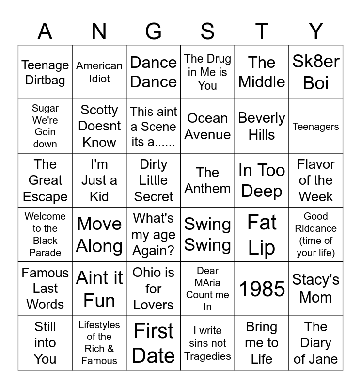 This bingo card has 36 words: Dear MAria Count me In, Ohio is for Lovers, I write sins not Tragedies, Sugar We're Goin down, Welcome to the Black Parade, The Anthem, Scotty Doesnt Know, First Date, The Middle, 1985, Teenagers, The Drug in Me is You, Stacy's Mom, I'm Just a Kid, Ocean Avenue, Teenage Dirtbag, Famous Last Words, In Too Deep, The Great Escape, Dance Dance, Dirty Little Secret, Move Along, Swing Swing, What's my age Again?, Fat Lip, American Idiot, Beverly Hills, Lifestyles of the Rich & Famous, This aint a Scene its a......, Sk8er Boi, The Diary of Jane, Still into You, Good Riddance (time of your life), Flavor of the Week, Aint it Fun and Bring me to Life.