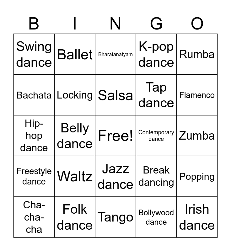 This bingo card has a free space and 25 words: Waltz, Tango, Salsa, Cha-cha-cha, Rumba, Swing dance, Bachata, Ballet, Contemporary dance, Jazz dance, Tap dance, Hip-hop dance, Break dancing, Popping, Locking, Line dance, Zumba, Bharatanatyam, Flamenco, Belly dance, Irish dance, Folk dance, Freestyle dance, K-pop dance and Bollywood dance.