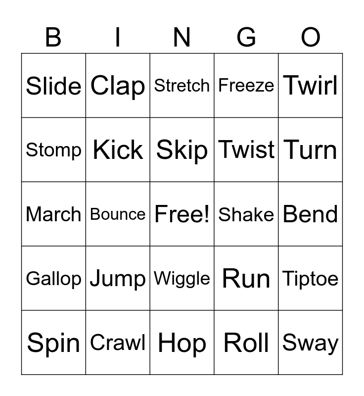 This bingo card has a free space and 25 words: Jump, Hop, Skip, Spin, Twirl, Slide, Stomp, Clap, Shake, Wiggle, Twist, March, Run, Tiptoe, Kick, Reach, Bend, Stretch, Turn, Bounce, Sway, Crawl, Gallop, Freeze and Roll.