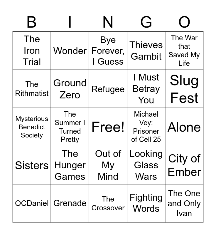 This bingo card has a free space and 24 words: The Hunger Games, Grenade, Refugee, OCDaniel, The War that Saved My Life, The Iron Trial, The Rithmatist, Wonder, Michael Vey: Prisoner of Cell 25, Out of My Mind, I Must Betray You, Mysterious Benedict Society, Looking Glass Wars, City of Ember, Ground Zero, Fighting Words, Alone, Bye Forever, I Guess, Slug Fest, The Summer I Turned Pretty, The One and Only Ivan, Sisters, Thieves Gambit and The Crossover.