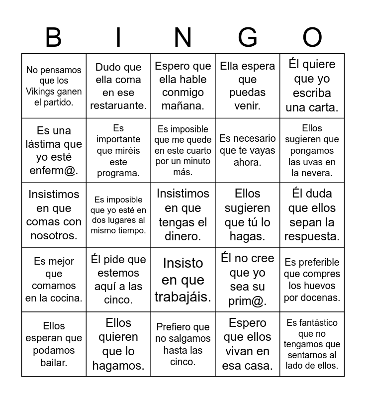 This bingo card has 45 words: Él prefiere que yo hable., Insistimos en que tengas el dinero., Quiero que Juan estudie., Ellos esperan que podamos bailar., Ella pide que sirváis el café., Espero que ellos vivan en esa casa., Espero que ella hable conmigo mañana., Quiero que comas el pan., Él quiere que yo escriba una carta., Ellos quieren que lo hagamos., Ella espera que puedas venir., Ellos sugieren que tú lo hagas., Insisto en que trabajáis., Él pide que estemos aquí a las cinco., ¿Por qué pides que yo lo haga?, Prefiero que no salgamos hasta las cinco., Ella espera que la conozcas., Insistimos en que comas con nosotros., ¿Quieres que yo cuente el dinero?, Ellos sugieren que pongamos las uvas en la nevera., Dudo que ella coma en ese restaruante., Ellos no creen que él toque el piano., Ella no está segura de que el café esté listo., No pensamos que los Vikings ganen el partido., ¿Por qué no crees que lo conozcamos?, Él duda que ellos sepan la respuesta., Ella no está segura de que siempre digamos la verdad., No estoy segur@ de que puedas leer esto., Él no cree que yo sea su prim@., Es mejor que comamos en la cocina., Es necesario que les llame mañana., Es preferible que compres los huevos por docenas., Es improbable que estén listos para las cinco., Es importante que nadie sepa ese secreto., Es ridículo que tantos políticos no digan la verdad., Es imposible que yo esté en dos lugares al mismo tiempo., Es increíble que él hable cinco idiomas., Es una lástima que el helado tenga tantas calorías., Es fantástico que no tengamos que sentarnos al lado de ellos., Es imposible que me quede en este cuarto por un minuto más., Es una lástima que yo esté enferm@., Es necesario que te vayas ahora., Es mejor que comamos las verduras., Es importante que miréis este programa. and Creo que Juan tiene el dinero..