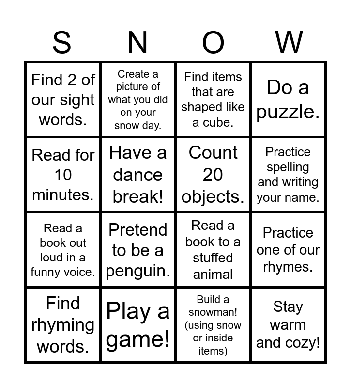 This bingo card has 16 words: Play a game!, Practice one of our rhymes., Find items that are shaped like a cube., Find 2 of our sight words., Read a book out loud in a funny voice., Create a picture of what you did on your snow day., Read a book to a stuffed animal, Build a snowman! (using snow or inside items), Read for 10 minutes., Have a dance break!, Find rhyming words., Do a puzzle., Pretend to be a penguin., Practice spelling and writing your name., Count 20 objects. and Stay warm and cozy!.