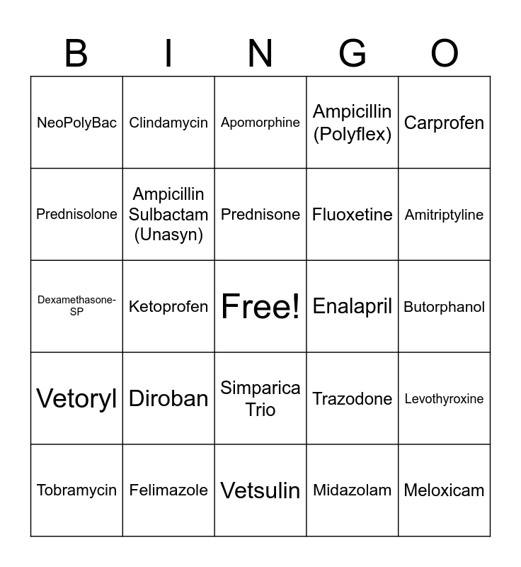 This bingo card has a free space and 77 words: Omeprazole, Sucralfate, Apomorphine, Metoclopramide, Metronidazole, Mirtazapine, Famotidine, Proviable, Entyce, Cerenia, Gabapentin, Depo-Medrol, Prednisone, Prednisolone, Onsior, Ketoprofen, Tramadol, Meloxicam, Buprenorphine, Carprofen, Prazosin, Dexamethasone-SP, Ampicillin Sulbactam (Unasyn), Clindamycin, Ampicillin (Polyflex), Convenia, Cefazolin, Simplicef, Baytril (Enrofloxacin), Clavamox, Doxycycline, Ketoconazole, Alprazolam, Trazodone, Amitriptyline, Fluoxetine, Dexdomitor, DKT, Butorphanol, Midazolam, Acepromazine, Propofol, Antisedan, Optimmune, Atropine, Terramycin, Tobramycin, NeoPolyBac, NeoPolyDex, Heartgard, Nexgard, Simparica Trio, Capstar, Revolution, Albon, Panacur, Pyrantel, Proheart, Drontal Plus, Praziquantel, Diroban, Cytopoint, Apoquel, Chlorpheniramine, Lactulose, Phenobarbital, Pimobendan, Enalapril, Amlodipine, Tresaderm, Zonisamide, Levothyroxine, Vetoryl, Felimazole, Aminophylline, Vetsulin and Furosemide.