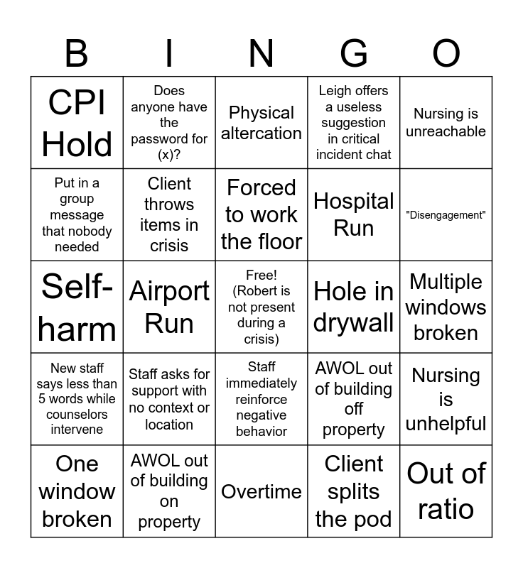 This bingo card has a free space and 24 words: Staff asks for support with no context or location, AWOL out of building on property, Forced to work the floor, One window broken, Nursing is unreachable, CPI Hold, Put in a group message that nobody needed, Does anyone have the password for (x)?, Hole in drywall, Staff immediately reinforce negative behavior, Hospital Run, Self-harm, AWOL out of building off property, Nursing is unhelpful, Client throws items in crisis, Client splits the pod, Multiple windows broken, Physical altercation, "Disengagement", Airport Run, Out of ratio, New staff says less than 5 words while counselors intervene, Leigh offers a useless suggestion in critical incident chat and Overtime.